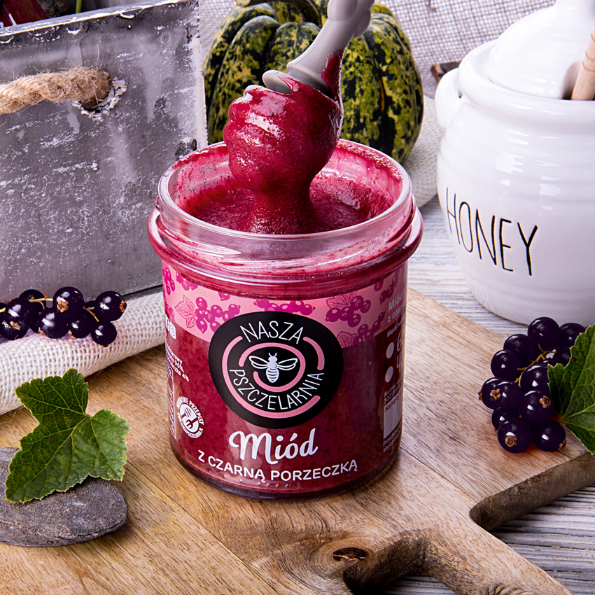 Intensywny kolor miodu z czarną porzeczką to pierwsza zachęta, by spróbować go prosto ze słoiczka. Słodki smak miodu wielokwiatowego zmieszaliśmy z liofilizatem kwaskowego owocu czarnej porzeczki. To wyjątkowa kombinacja smaków, a przy tym źródło wielu witamin – prozdrowotne składniki prawdziwego miodu uzupełnione bombą witaminową letnich owoców. Liofilizowane czarne porzeczki nie tracą swoich drogocennych właściwości, są jedynie pozbawione wody, tak, aby idealnie połączyć się z konsystencją miodu wielokwiatowego.