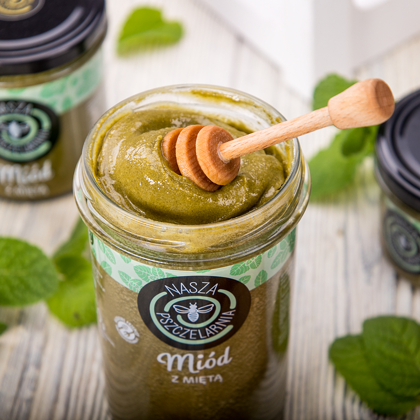- Wzbogacony o suszone liście mięty, miód działa kojąco na układ pokarmowy