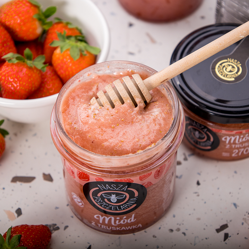Aromatyczny i zmysłowy miód z truskawką doskonale sprawdzi się na pierwsze i drugie śniadanie – z powodzeniem może być dodatkiem do granoli, jogurtu naturalnego lub chrupiącej kromki chleba. Miód z truskawką będzie również świetnym dodatkiem do naleśników oraz lodów. Doskonale sprawdzi się również jako substytut słodkiej przekąski w ciągu dnia – na łyżeczce prosto ze słoiczka.