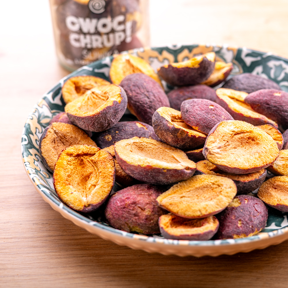 Intensywny aromat i naturalna słodycz śliwek zamknięte w chrupiącej formie – to właśnie Owoc Chrup – Śliwka liofilizowana. Starannie wyselekcjonowane, dojrzałe śliwki poddaliśmy procesowi liofilizacji, który pozwala zachować ich smak, zapach i cenne wartości odżywcze – bez dodatku cukru, konserwantów czy sztucznych barwników. W 40-gramowym słoiku kryje się 100% owocu, pozbawionego jedynie wody – dzięki temu śliwka zyskuje chrupkość i wyjątkową intensywność smaku.
