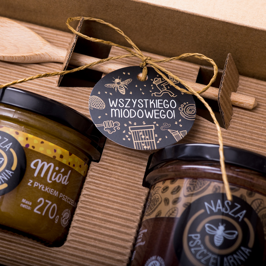 W tym eleganckim pudełku w opasce okolicznościowej znajdziesz idealny upominek na każdą okazję. Wybierz zestaw biały lub czarny oraz jedną z 4 zawieszek. Skompletuj 3 smaki miodu dla obdarowywanej osoby, niech poczuje się naprawdę słodko!