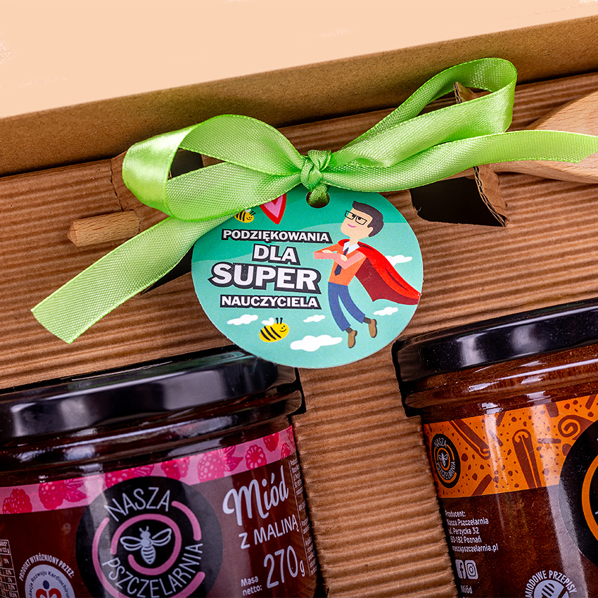 W tym eleganckim pudełku w opasce okolicznościowej znajdziesz idealny upominek dla Pani nauczycielki lub Pana nauczyciela. Wybierz 3 smaki miodu dla obdarowywanej osoby, niech poczuje się naprawdę słodko!