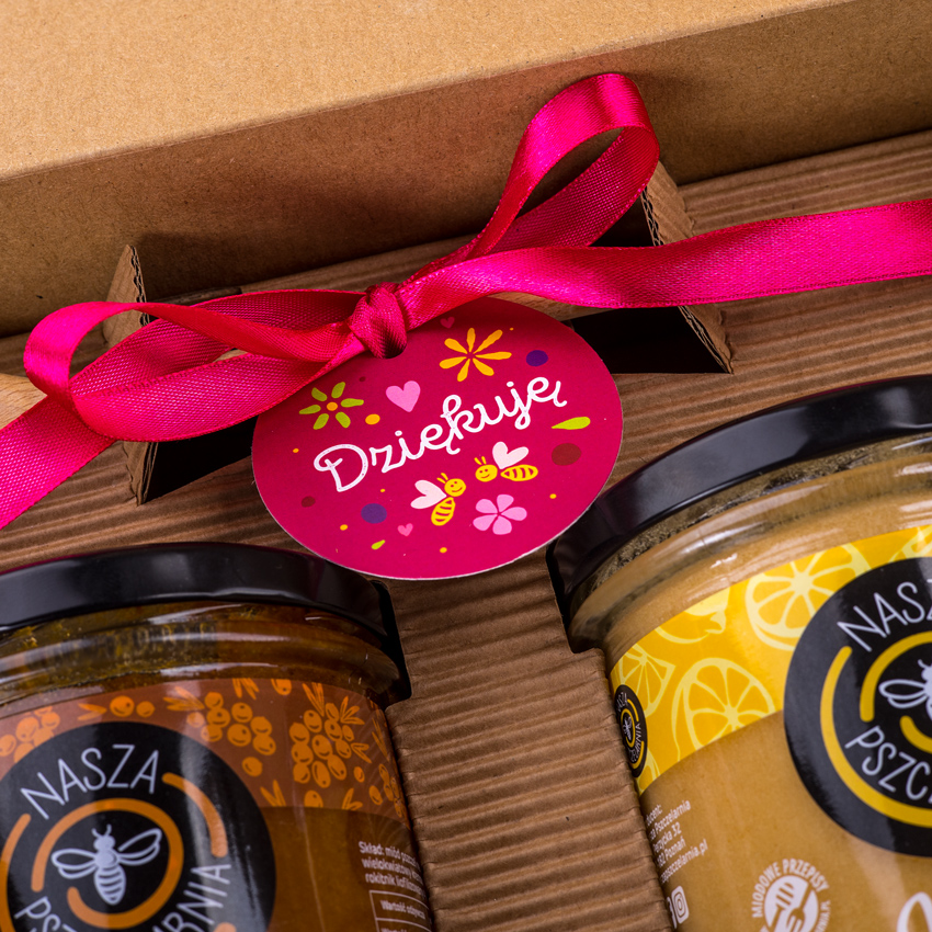 W tym eleganckim pudełku w opasce okolicznościowej znajdziesz idealny upominek na każdą okazję. Wybierz kolor opaski (biały, beżowy lub różowy) oraz zawieszkę. Wybierz 2 smaki miodu dla obdarowywanej osoby, niech poczuje się naprawdę słodko!