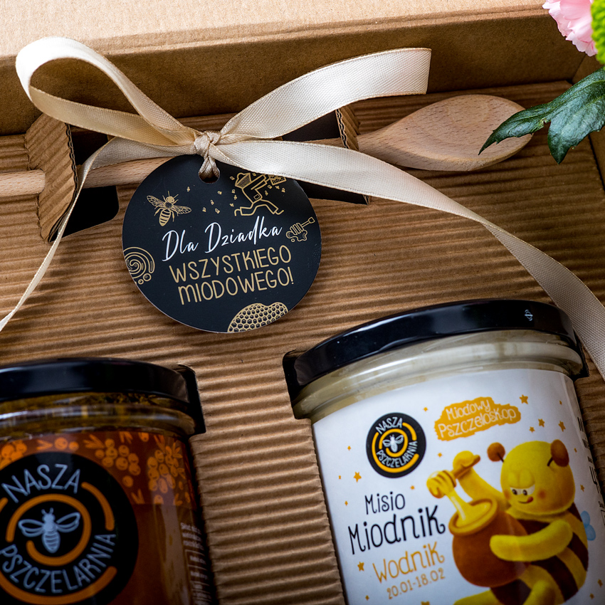 W tym eleganckim pudełku w opasce okolicznościowej znajdziesz idealny upominek dla Babci lub Dziadka. Wybierz etykietę na miód wielokwiatowy z jednym ze znaków zodiaku oraz smak drugiego miodu dla obdarowywanej osoby, niech poczuje się naprawdę słodko!