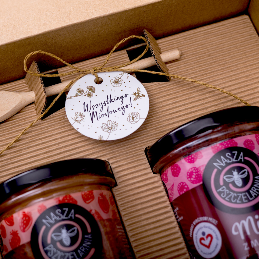 W tym eleganckim pudełku w opasce okolicznościowej znajdziesz idealny upominek na każdą okazję. Wybierz zestaw biały lub czarny oraz jedną z 4 zawieszek. Skompletuj 2 smaki miodu dla obdarowywanej osoby, niech poczuje się naprawdę słodko!