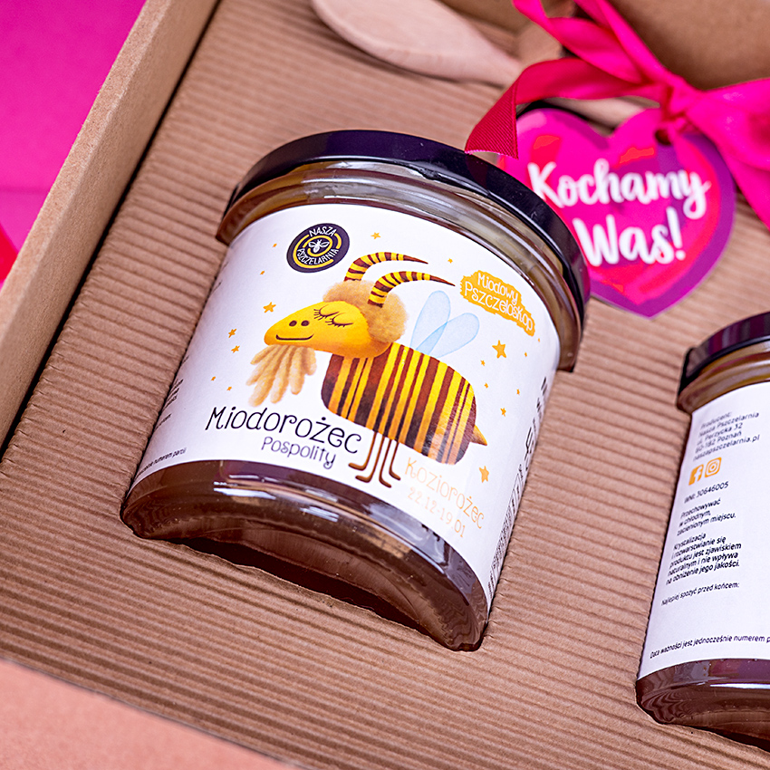 W tym eleganckim pudełku w opasce okolicznościowej znajdziesz idealny upominek na Walentynki. Wybierz etykiety na 2 miody wielokwiatowe ze znakami zodiaku dla obdarowywanych osób, niech poczuje się naprawdę słodko!
