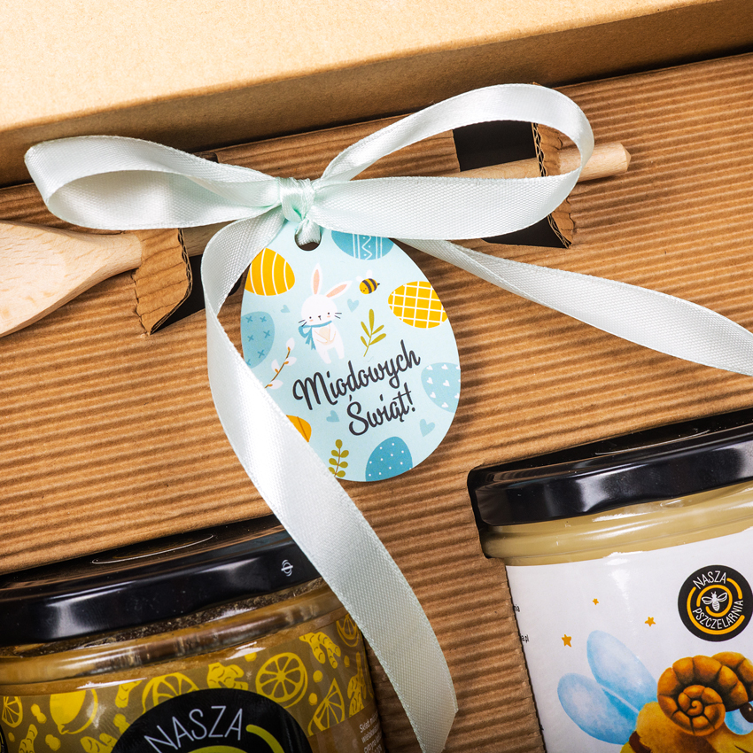 Zestaw upominkowy na Wielkanoc w pudełku kartonowym z opaską okolicznościową, zawieszką i łyżeczką z 1 miodem 420g/450g i z 1 miodem wielokwiatowym ze znakiem zodiaku do wyboru. Pokaż swoim bliskim, że o nich pamiętasz!