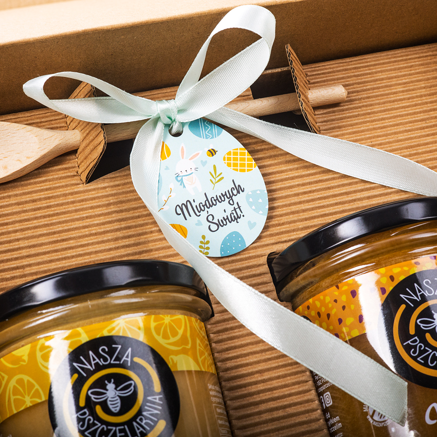 Zestaw upominkowy na Wielkanoc w pudełku kartonowym z opaską okolicznościową, zawieszką i łyżeczką z 2 miodami 420g/450g do wyboru. Pokaż swoim bliskim, że o nich pamiętasz!
